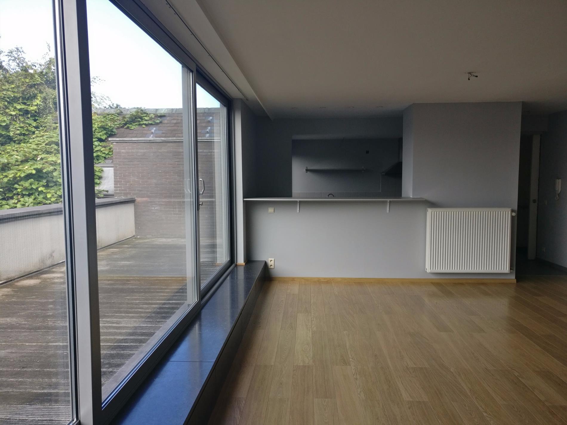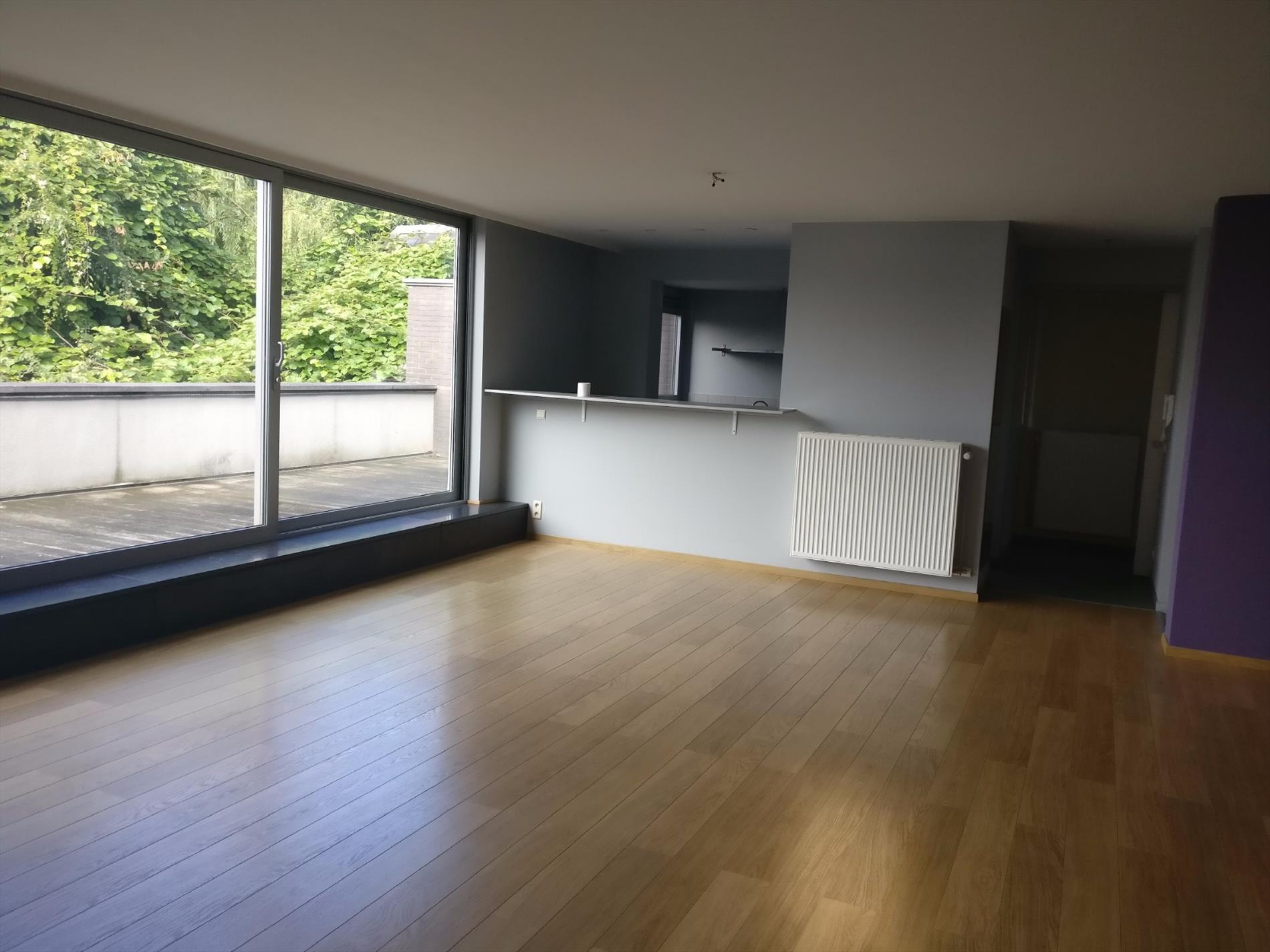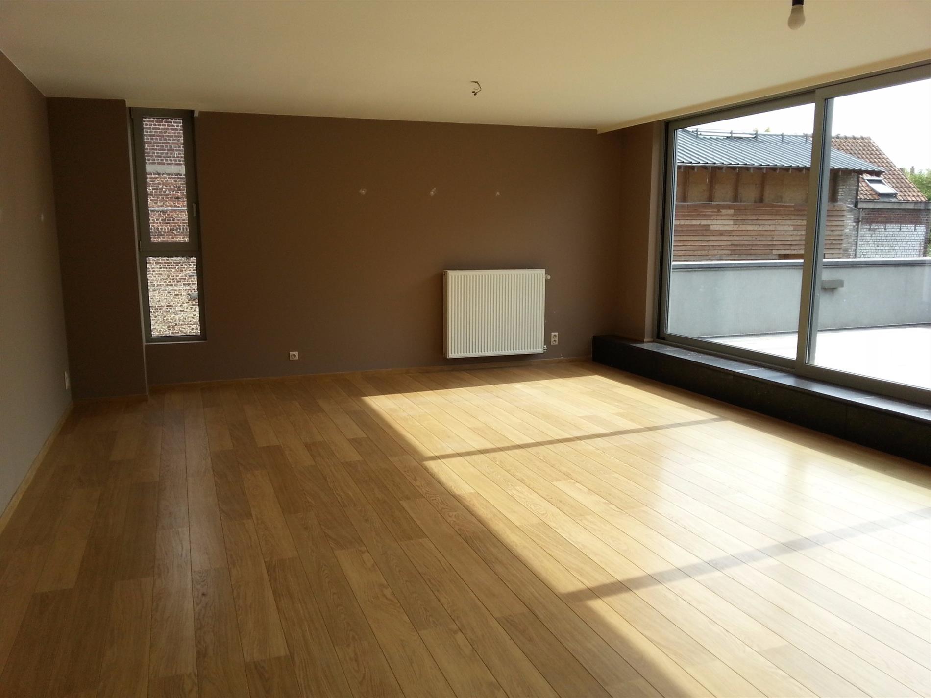 Appartement op de eerste verdieping (geen lift). Samenstelling: hal, woonkamer (25 m²) met aansluitend terras (20 m²), semi-open keuken ingericht met toestellen, toilet, 3 slaapkamers, badkamer met bad/douche. Geen lasten. Onmiddellijk beschikbaar.
