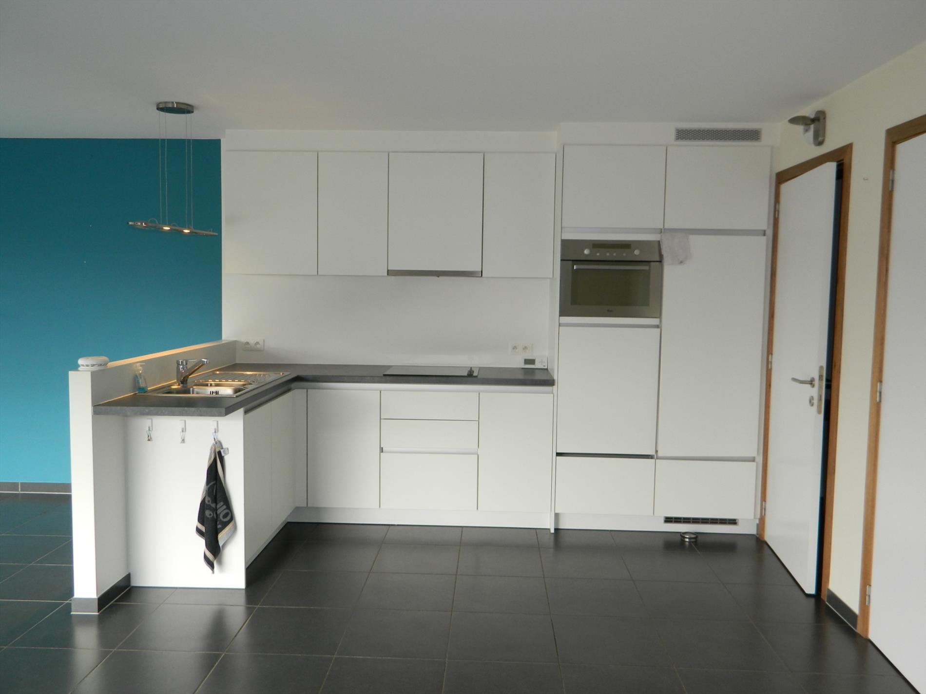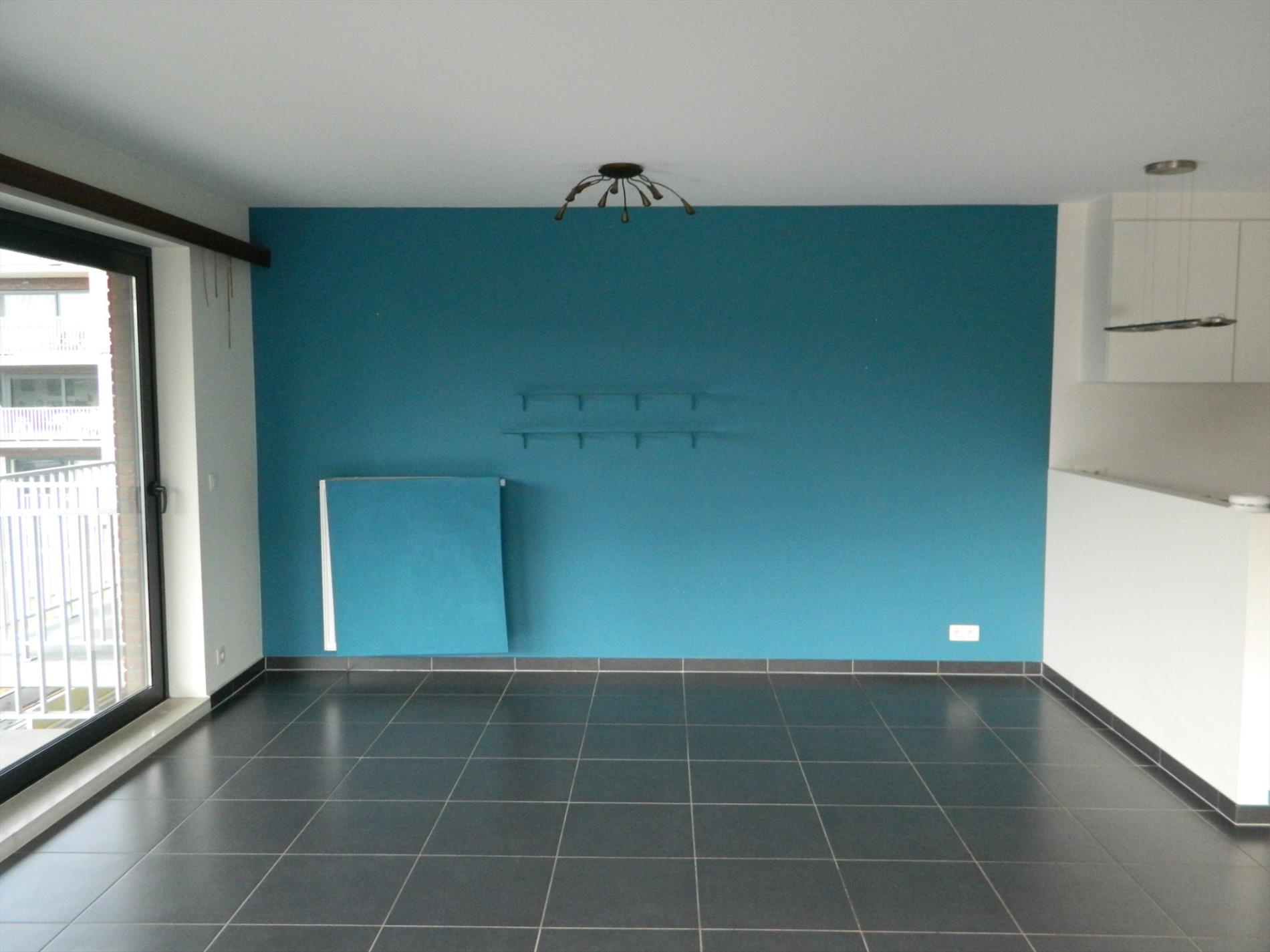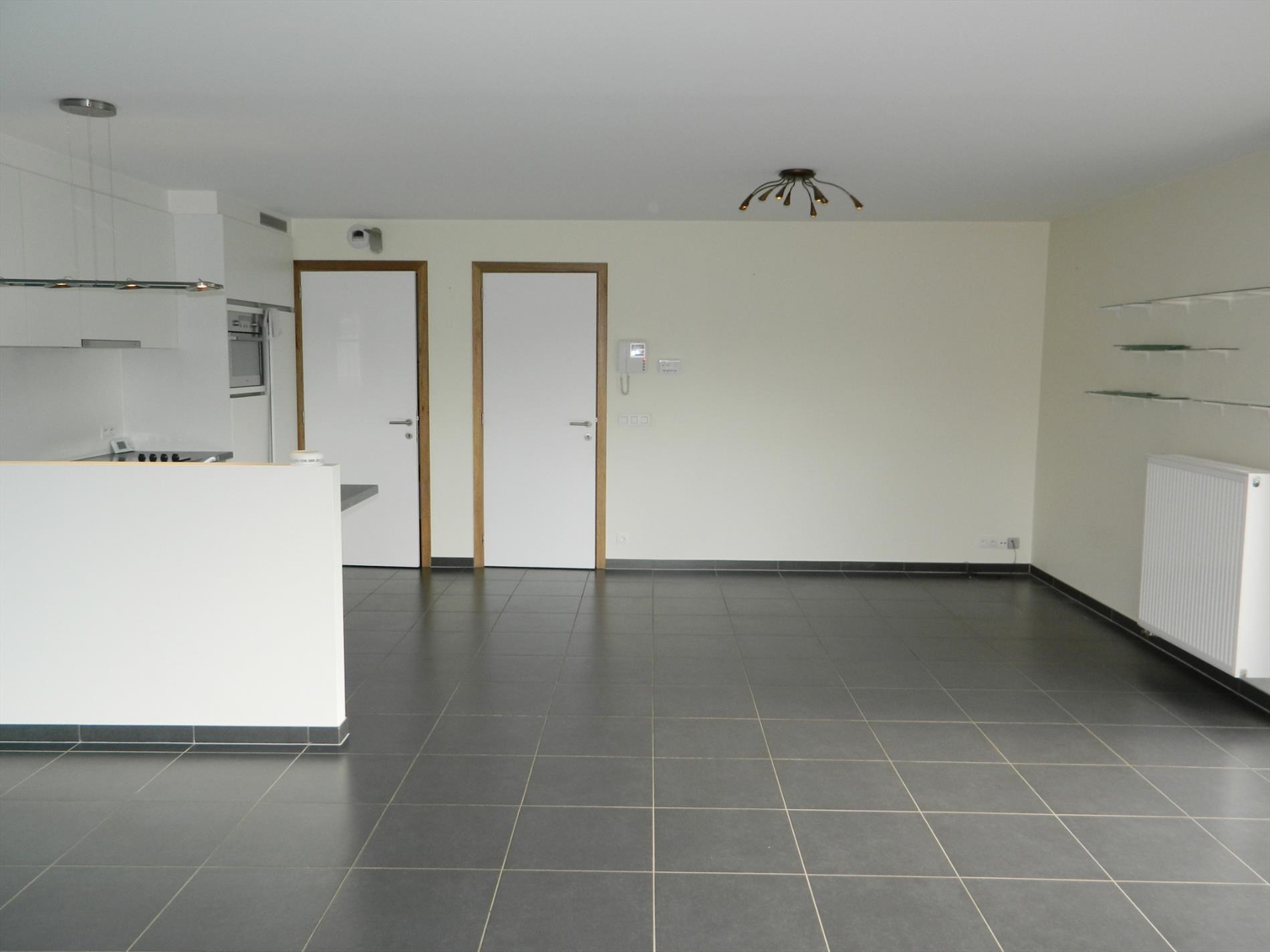 Nieuwbouwappartement (tweede bewoning) gelegen op de tweede verdieping in een gebouw met lift. Het appartement omvat: inkomhal met vestiaire, ruime living (45 m²) met open keuken, aansluitende berging,