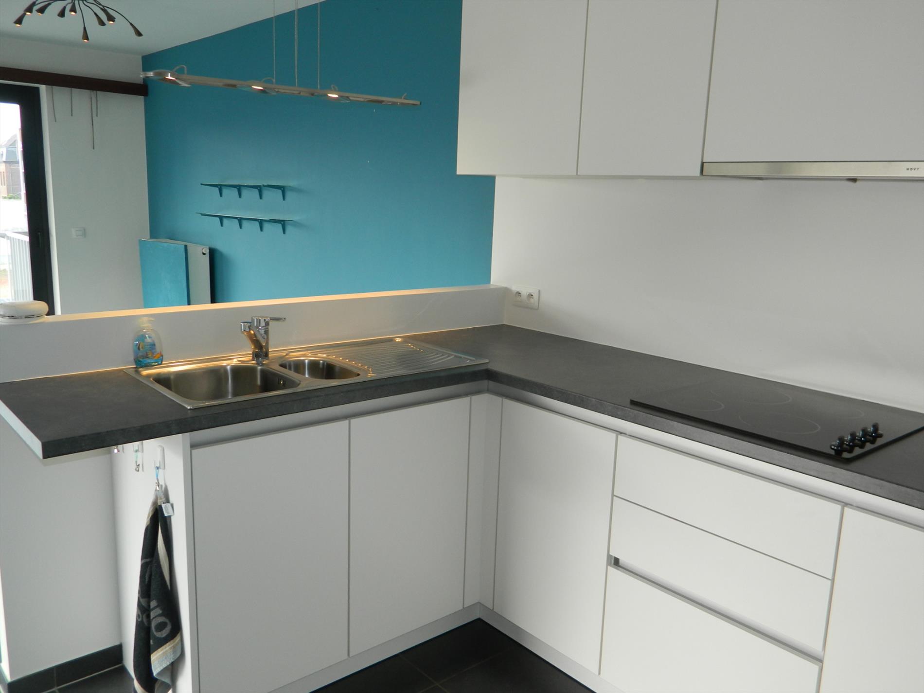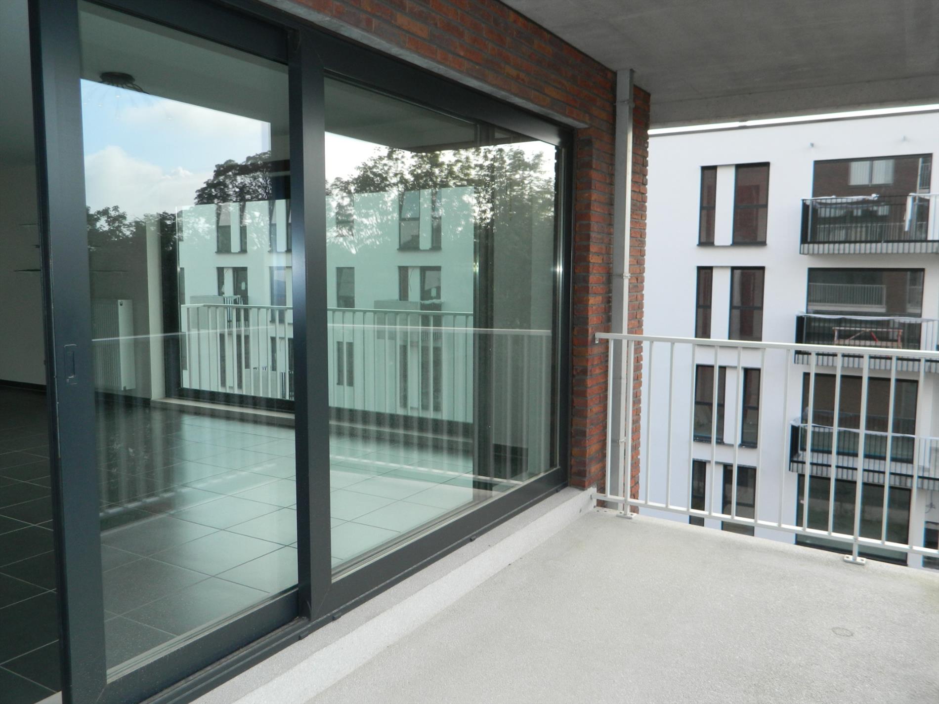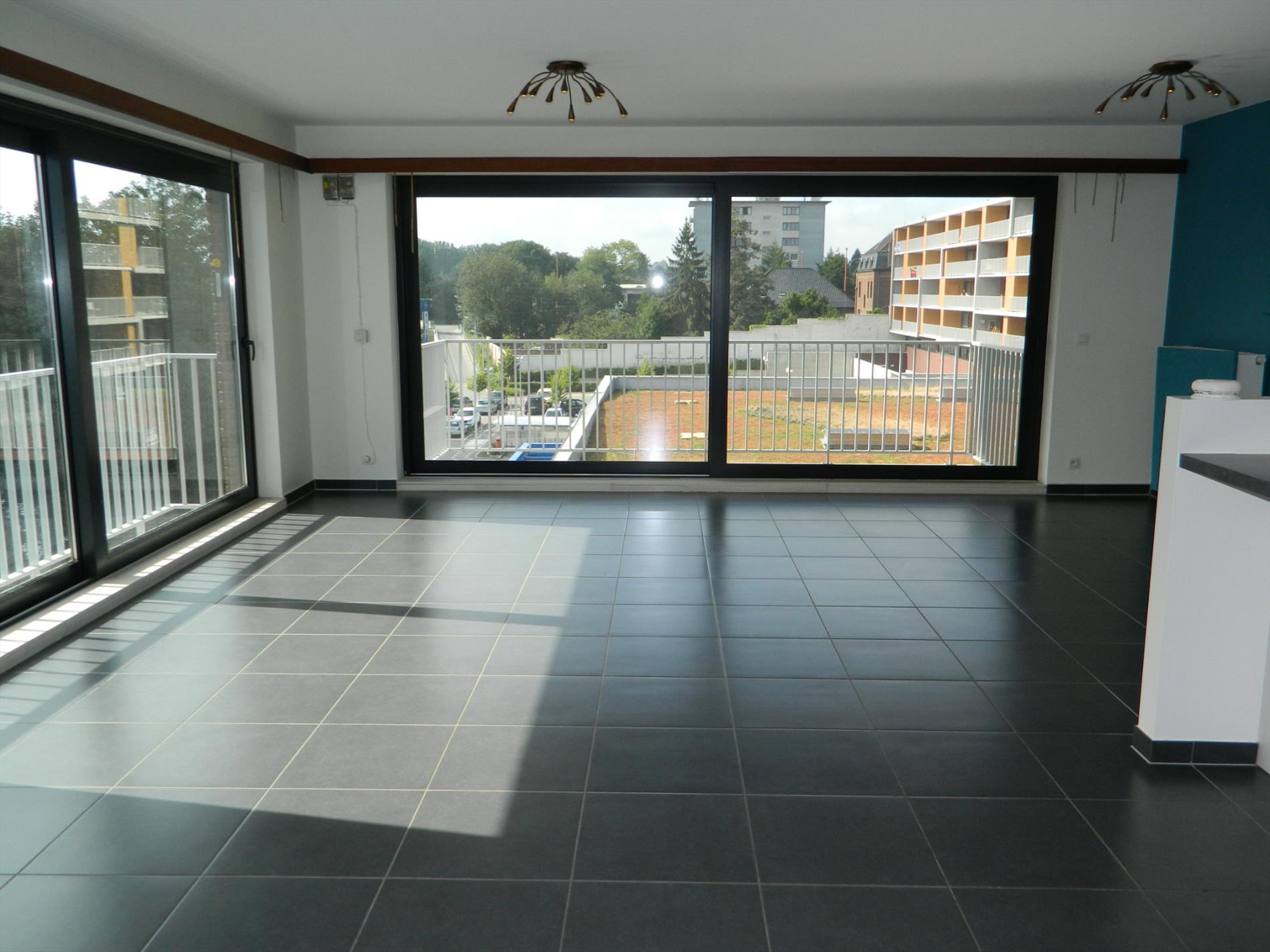 Nieuwbouwappartement (tweede bewoning) gelegen op de tweede verdieping in een gebouw met lift. Het appartement omvat: inkomhal met vestiaire, ruime living (45 m²) met open keuken, aansluitende berging,