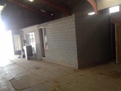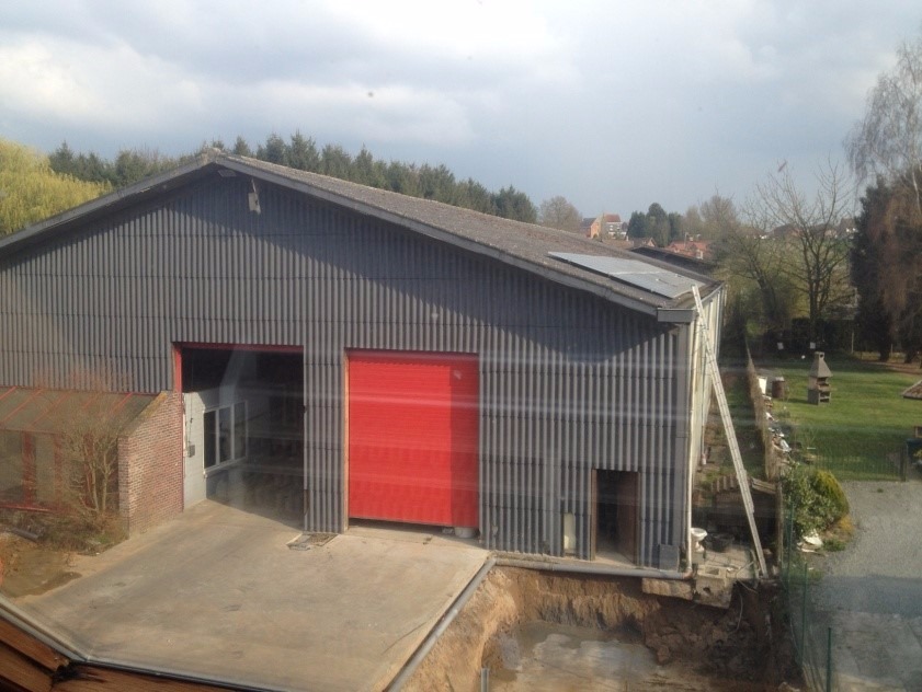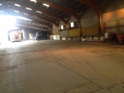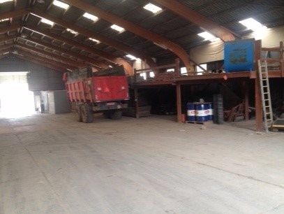 Houten gelameleerde spanboogspanten afgewerkt met eternitgolfplaten, zowel op dak als de zijwanden. Betonnen vloer, niet gepolierd en niet waterpas. Vrije hoogte 6 m. parkeermogelijkheid voor de loods.