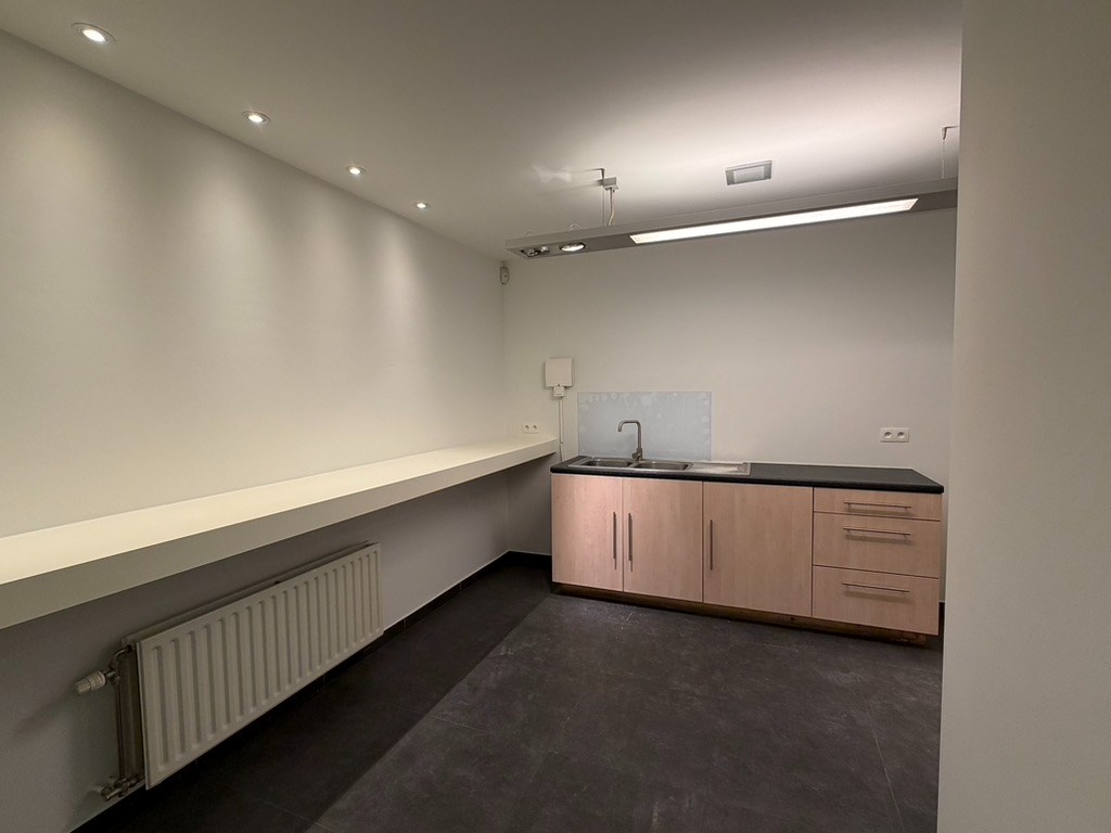 Indeling: ruimte (38 m²) met aparte inkomdeur en grote beglazing voor optimale lichtinval. Doorlopend naar achter een tweede ruimte (19 m²) met toegang naar aparte toilet en opbergruimte met kitchenette. Zie plan voor details.
