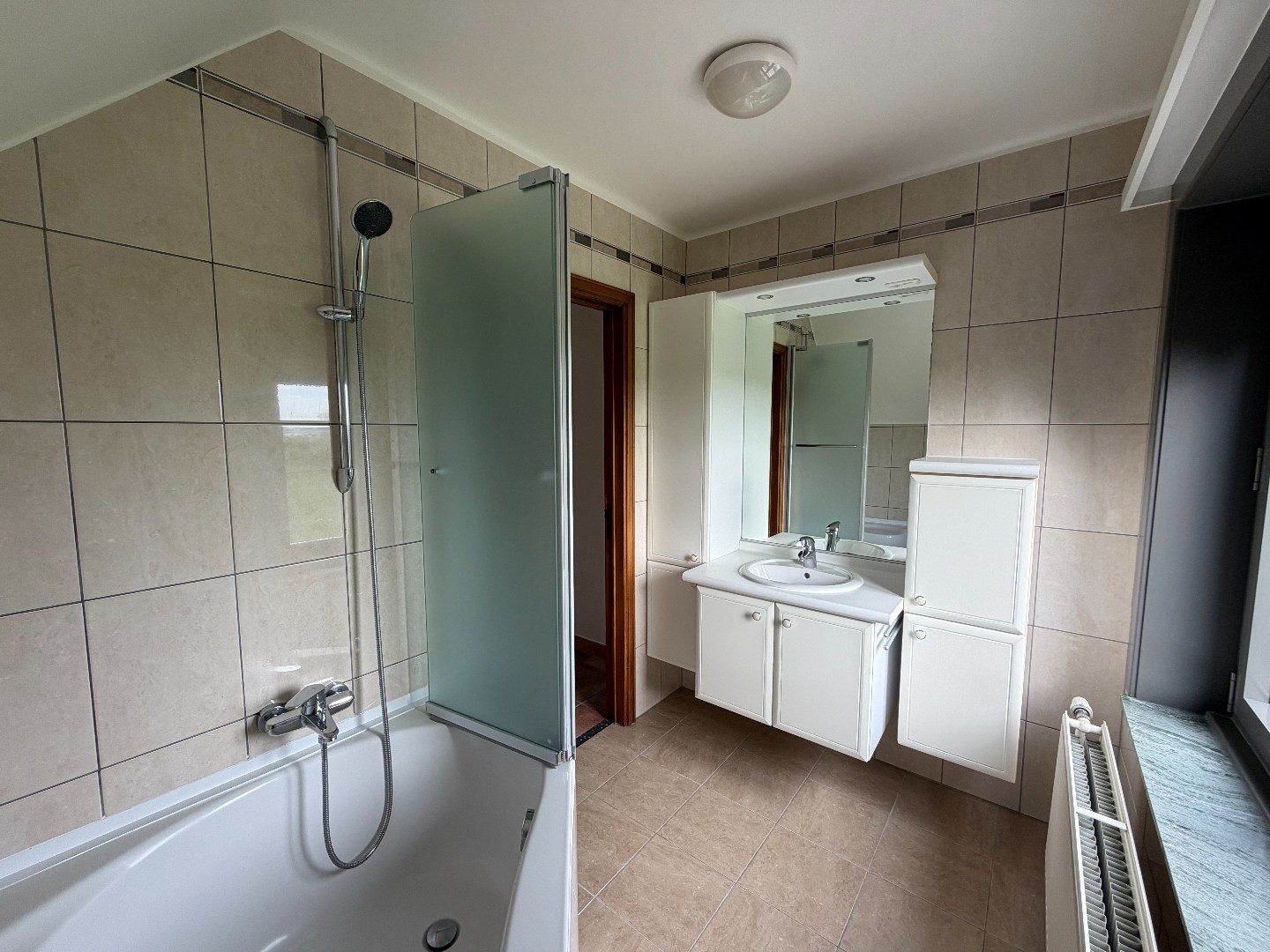 Indeling: ruime inkomhal, living met toegang tot terras, keuken en toilet. Op de eerste verdieping zijn er 2 ruime slaapkamers en een bureau, badkamer met lavabo en bad/douche, apart toilet. De gehele woning is onderkelderd en heeft een garage met automatische poort. Er is nog een oprit voor 3 staanplaatsen. De woning werd volledig nieuw geschilderd en is voorzien van rolluiken.
