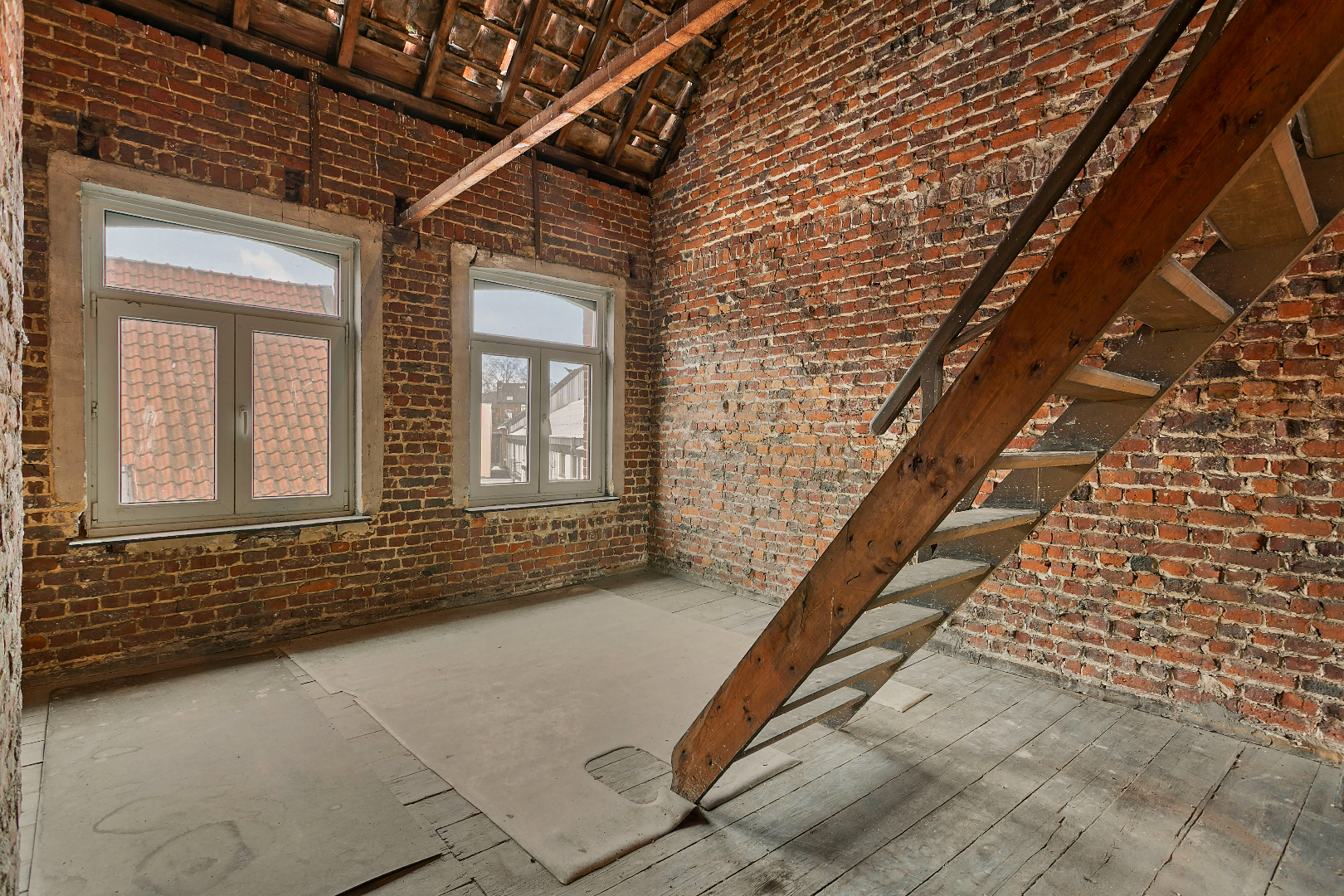 Indeling: centrale inkomhal, bureau, eetplaats, keuken, wasplaats en wc, ruim salon (34m²) met houtkachel. Ruime, bruikbare kelder van circa 50m². Op de eerste verdieping: 3 ruime slaapkamers, berging en badkamer. Op de tweede verdieping: 4 zolderkamers waarvan eentje met extra mezzanine. Inrichtbaar naar voorkeur. Achter de woning is er een ruim terras met toegang tot achterliggende weg waar het mogelijk zou zijn een garage te maken. Extra: bijgebouw met tal van mogelijkheden.