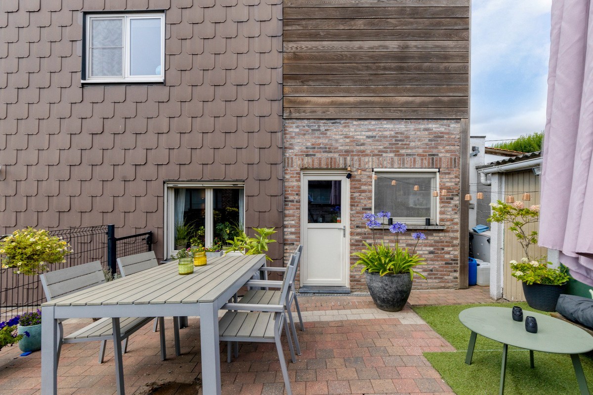 Aan de zijkant van de woning is er een parking voorzien. Er bevindt zich tevens een heel aangenaam groot terras met een extra bergruimte.