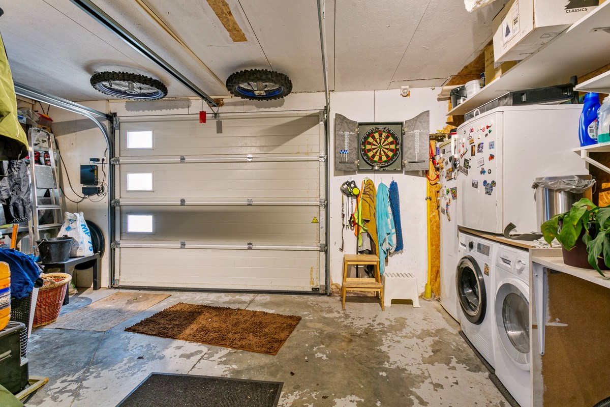 Indeling gelijkvloers: open woonkamer en eetkamer, ingerichte keuken, ruime garage met automatische sectionaalpoort, apart toilet. Terras en toegang tot gezellig tuintje met extra berging en fietsenstalling.