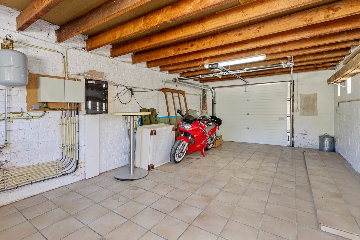 Aangrenzend aan de woning is er een ruime garage (27m²) met nieuwe geautomatiseerde sectionaalpoort. Alle aansluitingen ook aanwezig voor wasplaats. De woning is grotendeels onderkelderd wat zorgt voor heel wat extra opbergruimte.